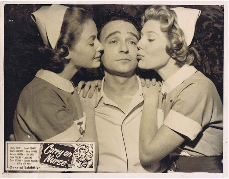 Heritage says the films don’t stand up to scrutiny. I disagree. For example, most who have seen one will likely remember the sexual objectification and harassment of female nurses in the hospital-based films. But does everyone remember the nurses collectivising and intervening to protest this treatment in the denouement of Carry On Nurse? Their pushback culminates in the film’s most enduring visual gag, when Wilfred Hyde-White’s nurse-ogling colonel undergoes rectal examination with a daffodil.