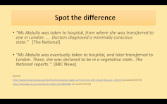 Rather than always being “vegetative” (completely unaware of herself and her environment), the National’s report stated that Abdulla had early on been diagnosed as “minimally conscious”. There were minimal and intermittent signs of some basic consciousness even if this was at a very low level. This meant that she was more likely to recover full consciousness than if she were in a vegetative state.